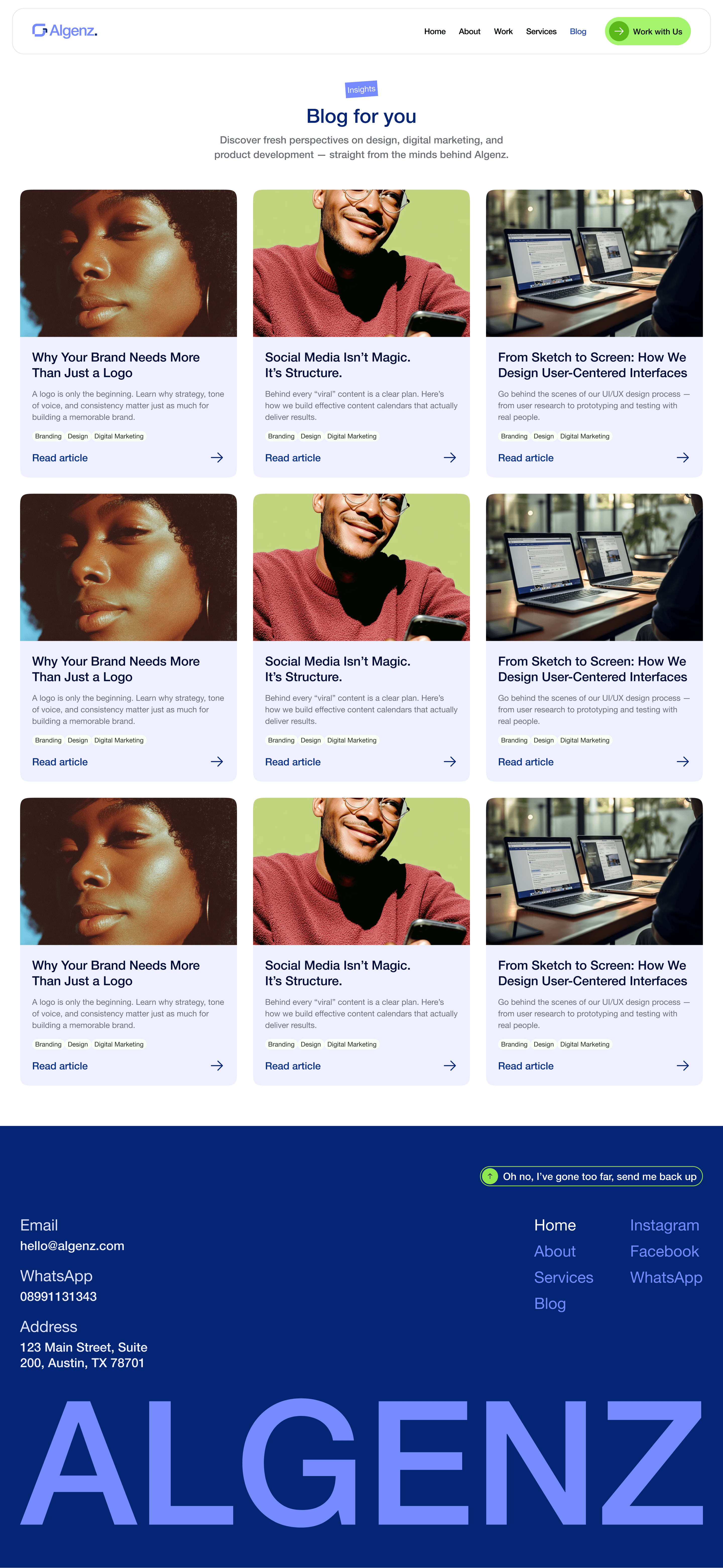 This page tells the story behind the agency. Who they are, how they work, and their values. The tone is approachable, not overly corporate, so visitors feel like they’re getting to know a real team, not just a “business profile.” It highlights Algenz as a creative partner you’d want to collaborate and grow with.